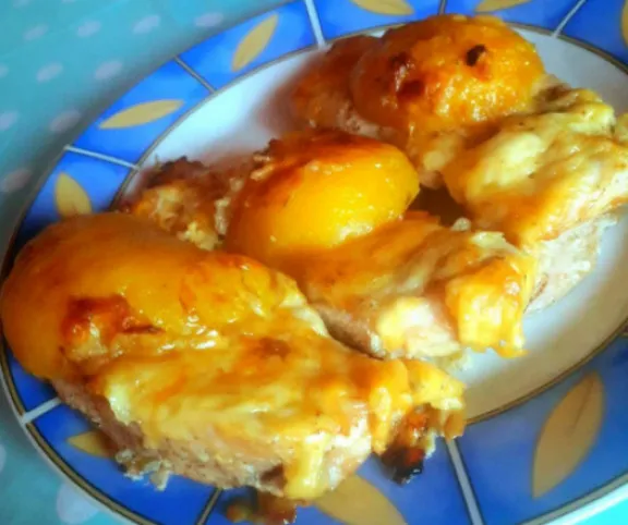 A roston sült csirkemell barackszeletet helyezünk sajttal megszórjuk és megsütjük