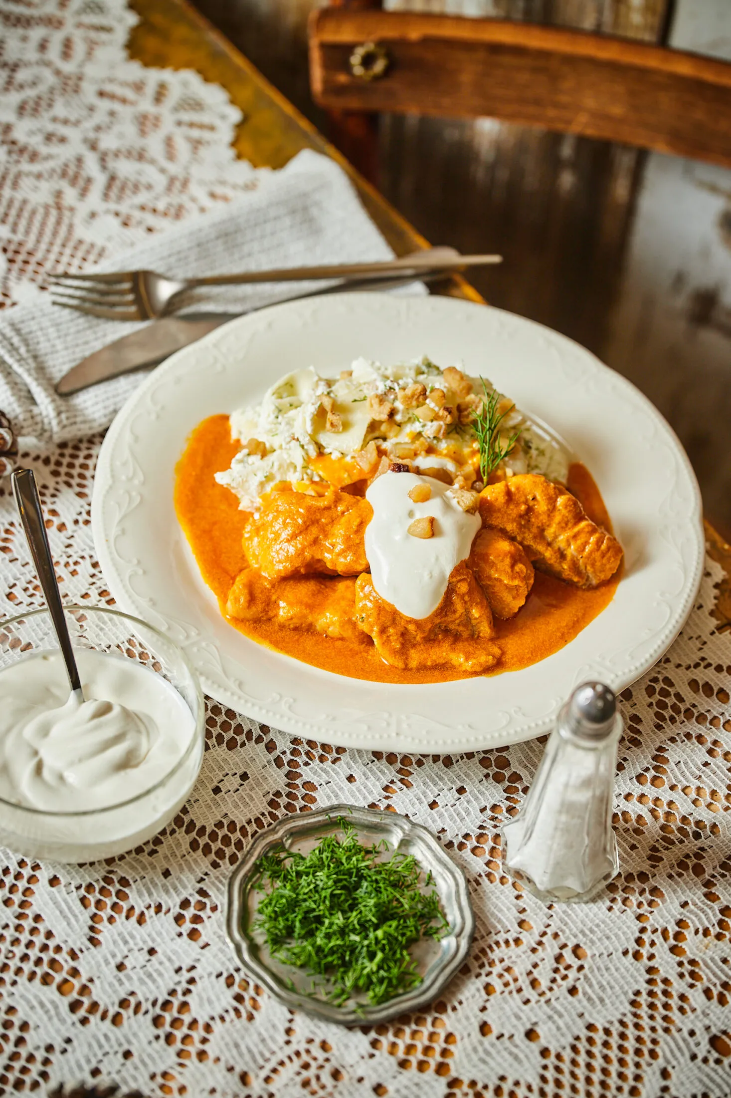 447 Harcsapaprikás magyarosan kapros-túrós galuskával