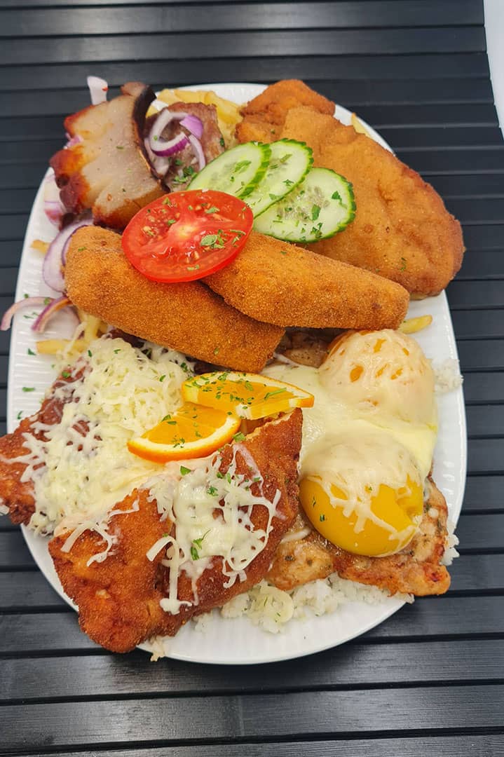 cordon bleu, őszibarackos csirkemell, borzas szelet, sült kacsacomb, rántott sajt, vegyesköret, párolt káposzta