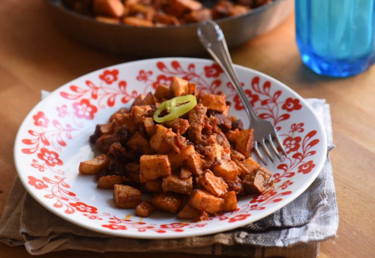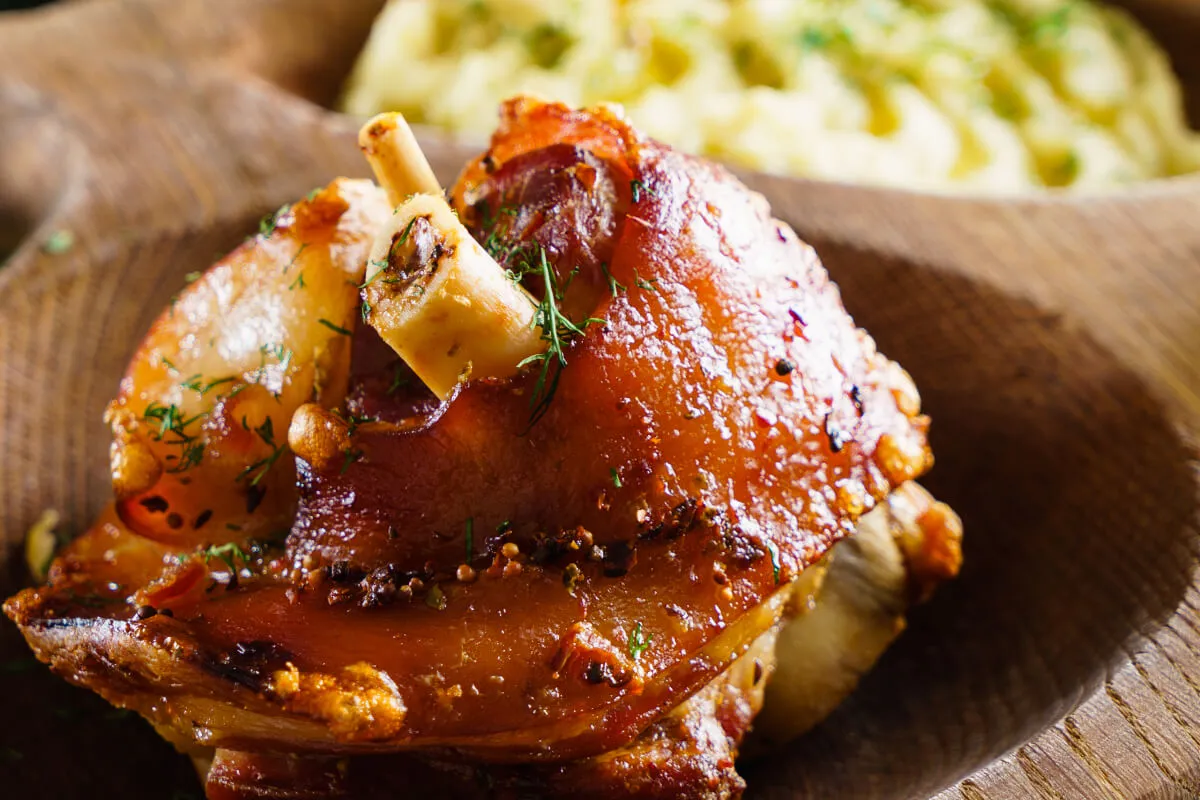 Sült csülök pirított burgonyával és lisztbe forgatott sült hagymával